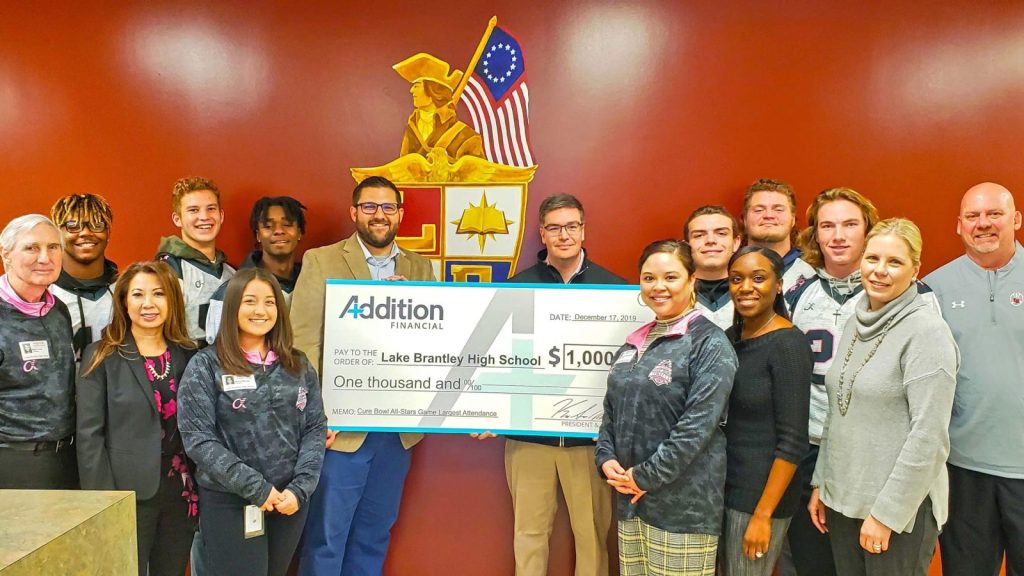 “This friendly competition between the central Florida area schools helped to generate some excitement and awareness for the Addition Financial Cure Bowl All-Stars among the students,” said Addition Financial Cure Bowl All-Stars General Manger Mark Line. “We are appreciative of the donation that Addition Financial has made to Lake Brantley High School for bringing the most fans out to the game.”
